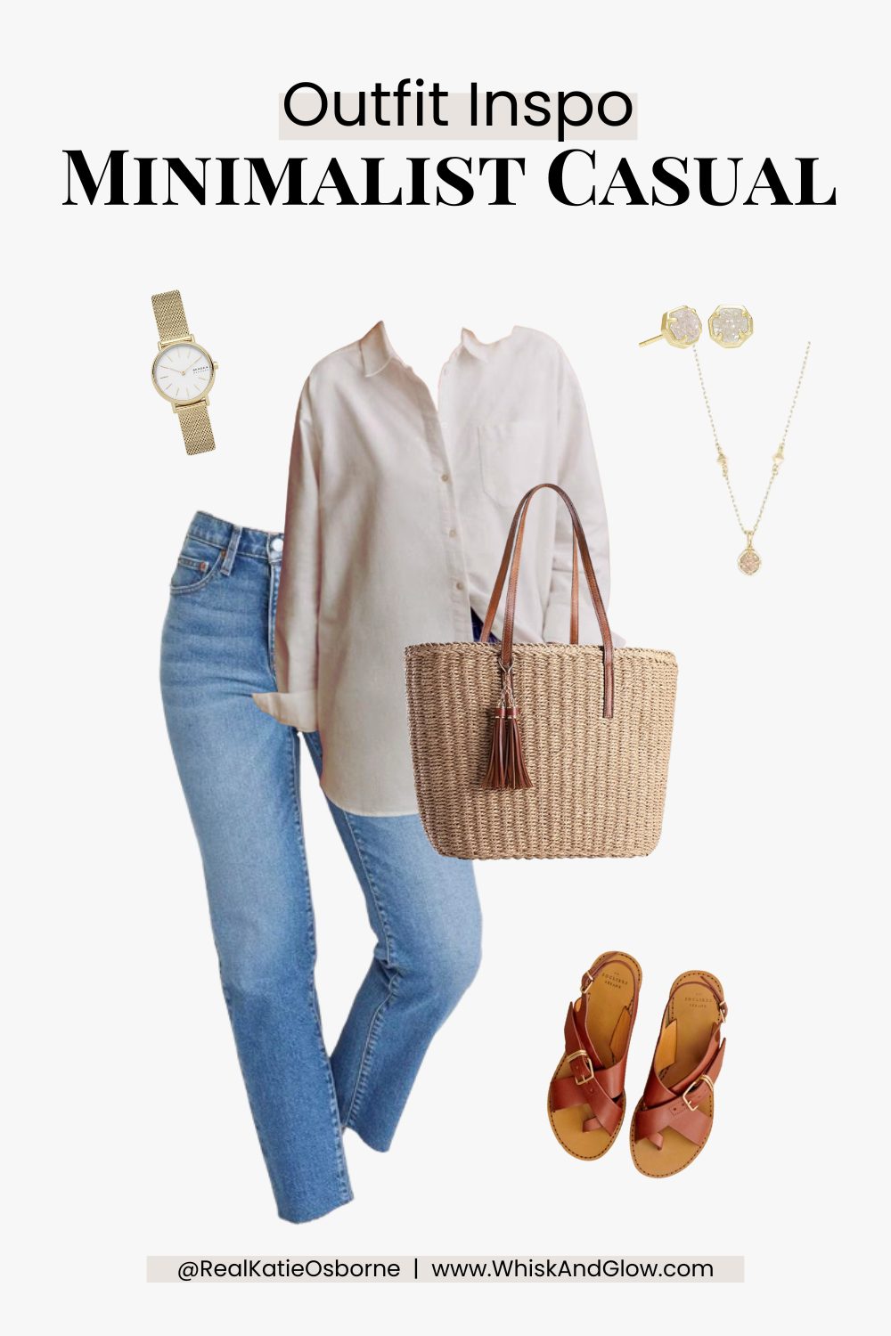 Discover the perfect minimalist casual spring outfit: cropped blue jeans, a white button-down, straw rattan tote, brown sandals, and chic jewelry for effortless style.